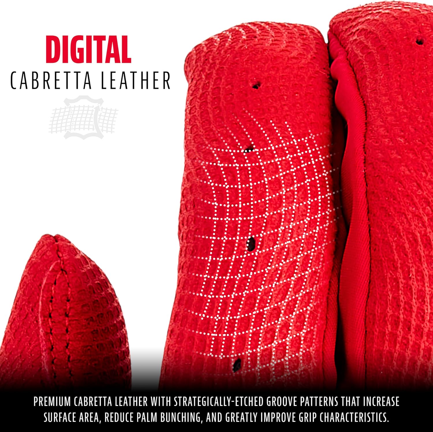 • DIGITAL CABRETTA LEATHER : Made with premium cabretta leather with strategically-etched groove patterns that increase surface area, reduce palm bunching, and greatly improve grip characteristics