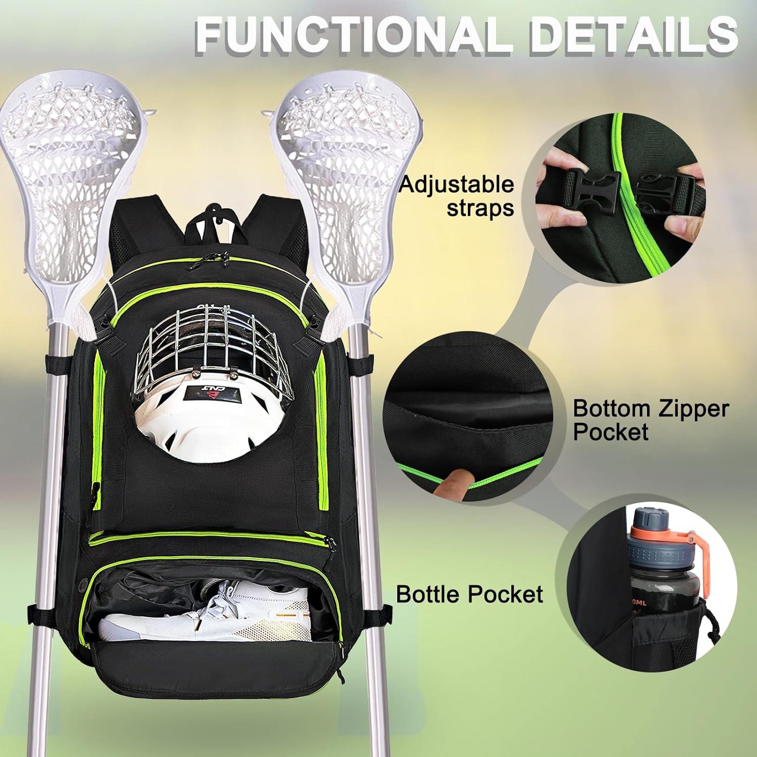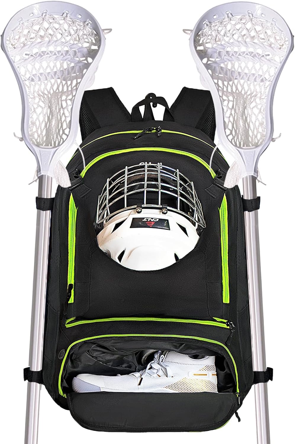 - 【Super Large Capacity】The Goloni Large Lacrosse Backpack features two upgraded side stick pockets that are suitable for various sizes of sticks, protecting your stick from damage and friction.The main compartment can accommodate helmets/masks, shoulder protectors, arm/elbow protectors, gloves, goggles, anti slip shoes, and all lacrosse equipment, while maintaining their order.External buckle strap can hold your helmet and keep it in place from shaking.