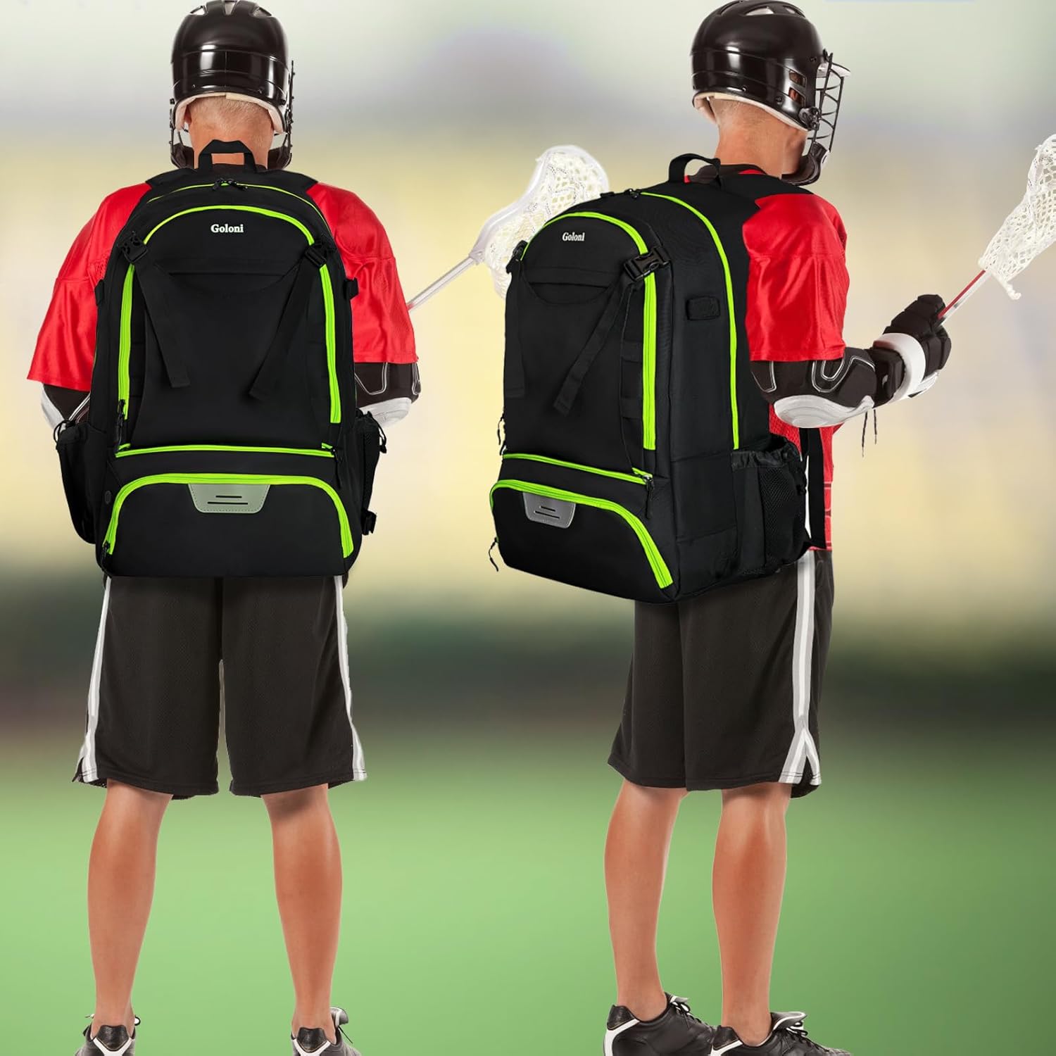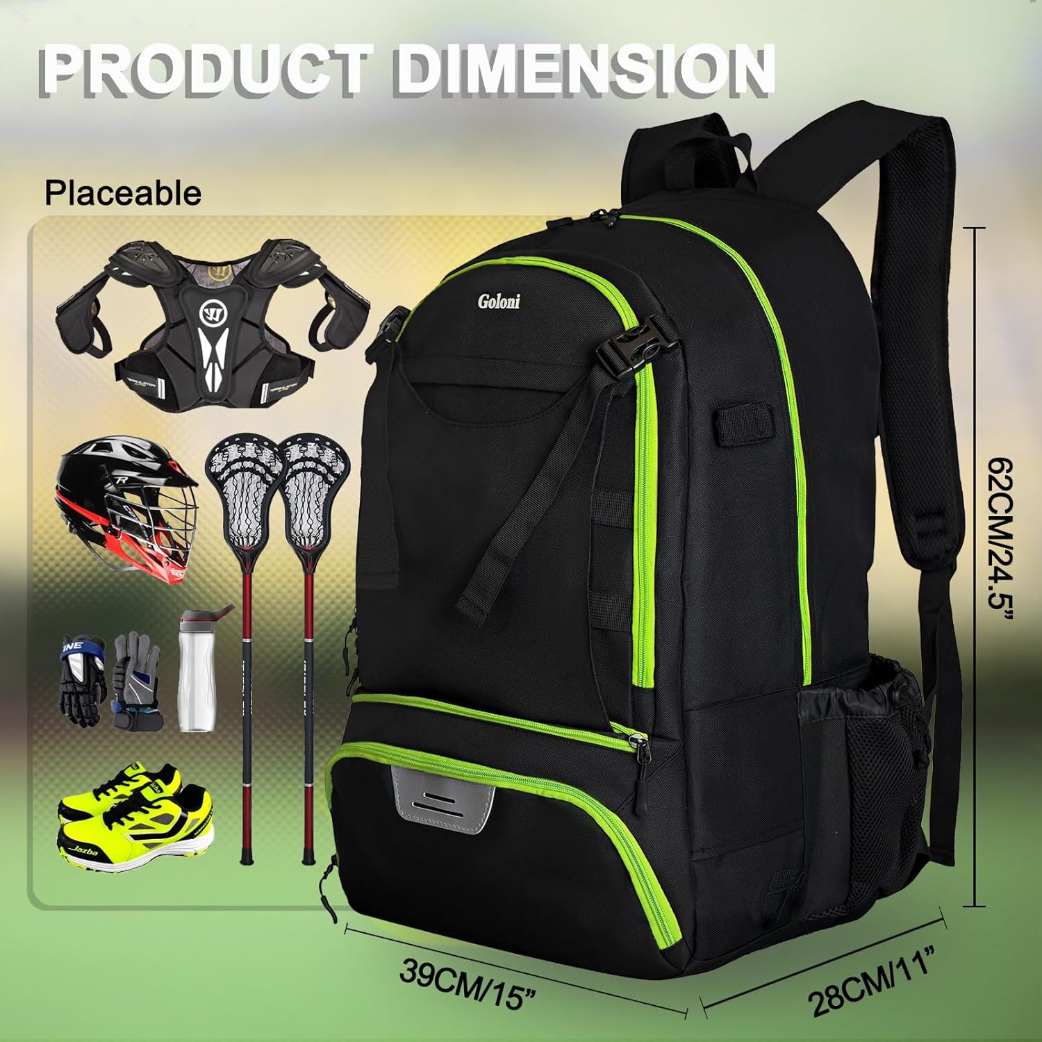 - [Separate Shoe Compartment] No more mixing dirty shoes with your gear. The Goloni Lacrosse Backpack has a separate shoe compartment, keeping your shoes separate and your gear organized.Ventilated hole enhance air circulation and disperse bad smell.